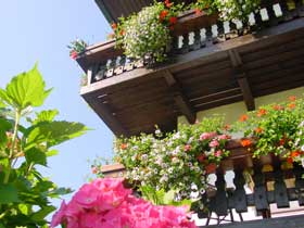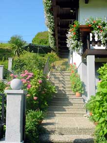 Durch ein "Blumenmeer" schreiten Sie zur Terasse, zum Eingang, und zum Frühstücksraum. |